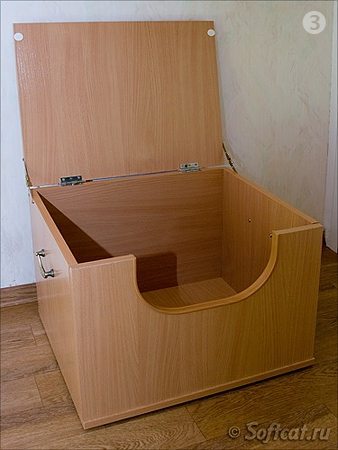 Для того чтобы защитить неуклюжих малышей от возможных травм и чтобы им легче было приучаться к туалету и когтеточке, я оборудую вокруг домика вольер. На фото хорошо видно что находится внутри – домик уже с выходом внизу, небольшая когтеточка и в углу крытый туалет-бокс с небольшим лотком с сеткой, такие "конструкции" стоят у меня по всему дому для взрослых кошек и малыши сразу приучаются к такому туалету.